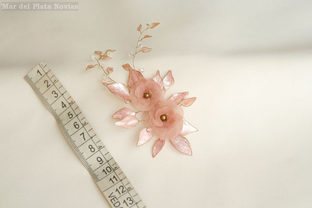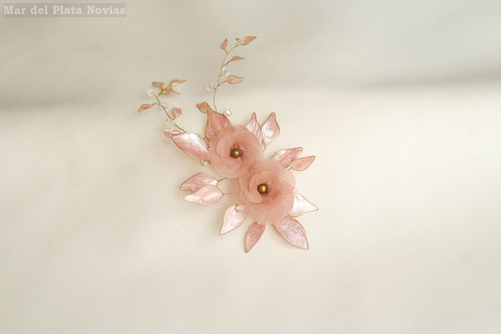 Tocado para novia con flores de seda natural en color rosa, hojas esmaltadas al tono y detalles en bronce.