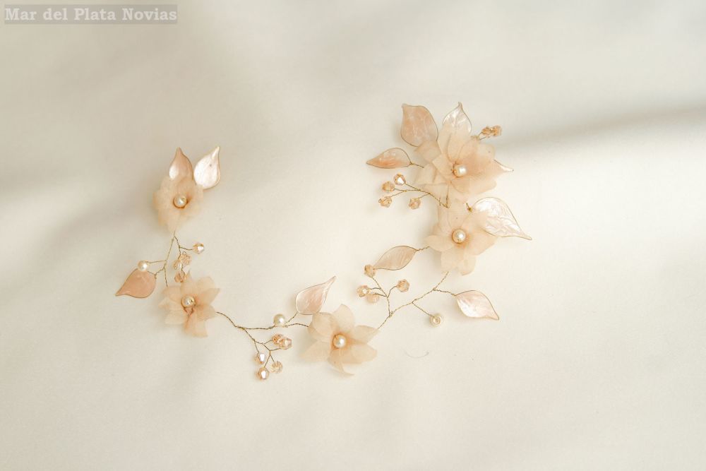 Tocado para novia con flores de seda natural en color rosa, hojas esmaltadas al tono y detalles en bronce.