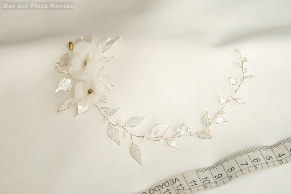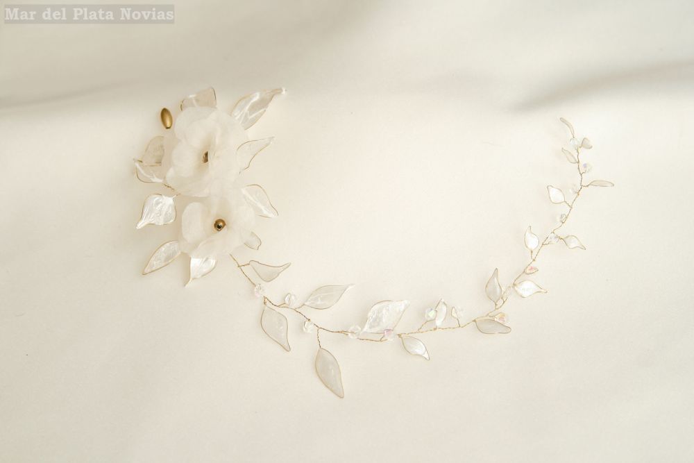 Tocado para novia con flores de seda natural en color rosa, hojas esmaltadas al tono y detalles en bronce.