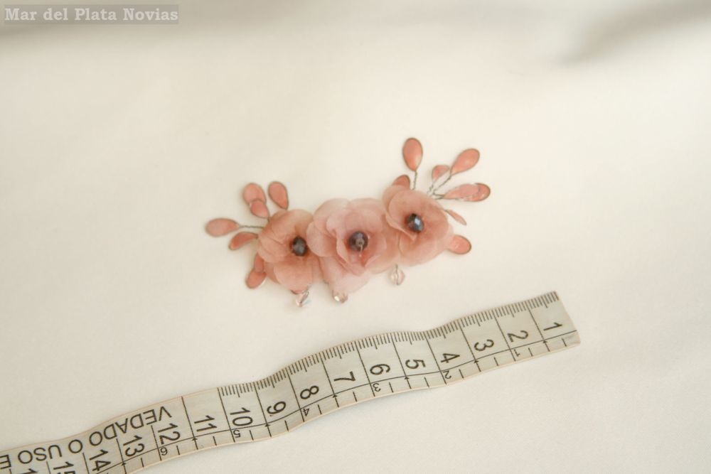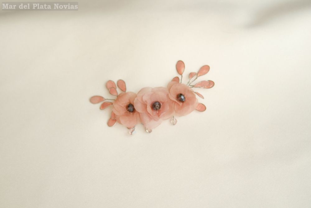 Tocado para novia con flores de seda natural en color rosa, hojas esmaltadas al tono y detalles en bronce.