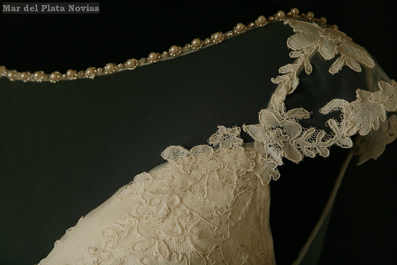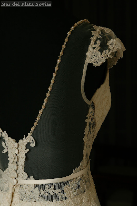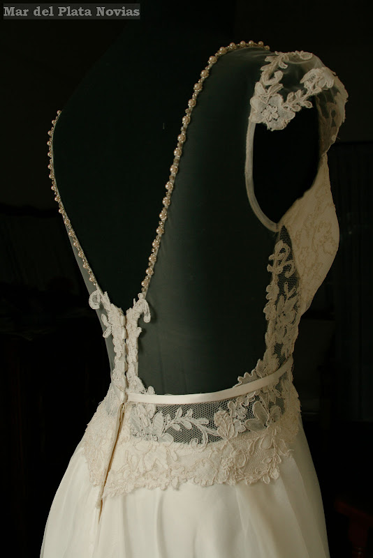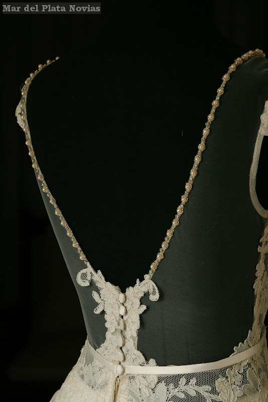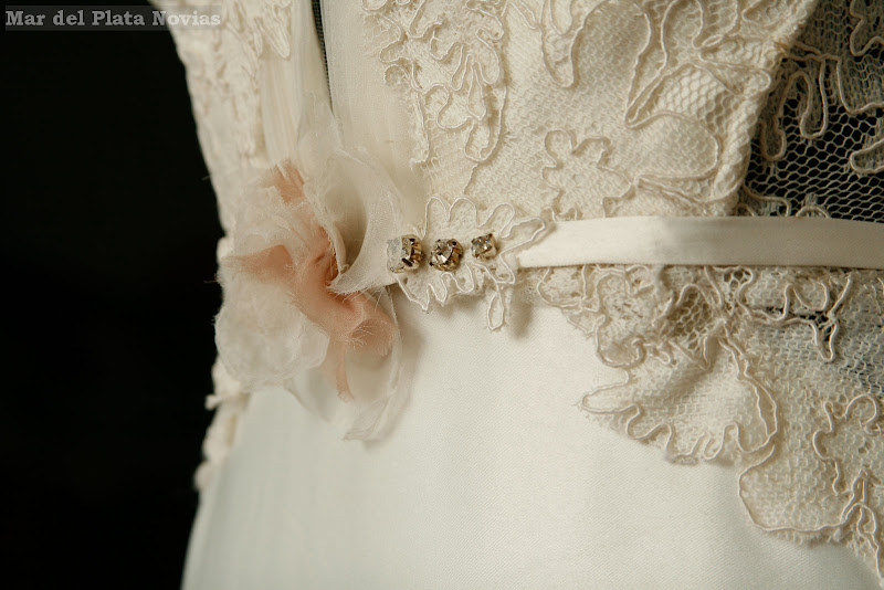 Vestido de novia estilo vintage, en satén y rebrodée color marfil, con espalda y laterales en transparencias, escote bordado en perlas color nude y cristales, sobrefalda en organza con detalle de flores tridimensionadas y perlas, cinturón en satén rematado con flor de organza de seda natural color nude y marfil con cristales checos.